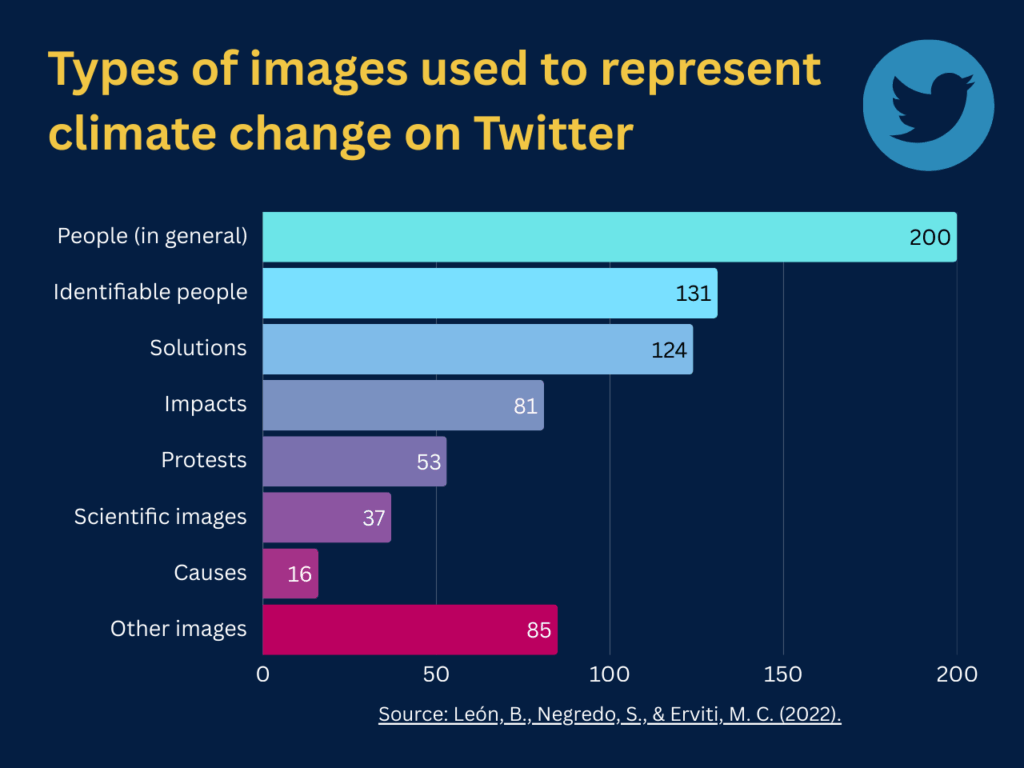 While traditional media often relies on polar bears and melting ice caps to represent climate change, the study results showed that Twitter users most frequently used images of people (52.36%), including identifiable people such as famous politicians, business leaders, actors or writers (31.26%). Images depicting climate solutions and climate change impacts were slightly less common. Images showing causes of climate change, like greenhouse gas emissions, were the least frequently observed (3.82%).