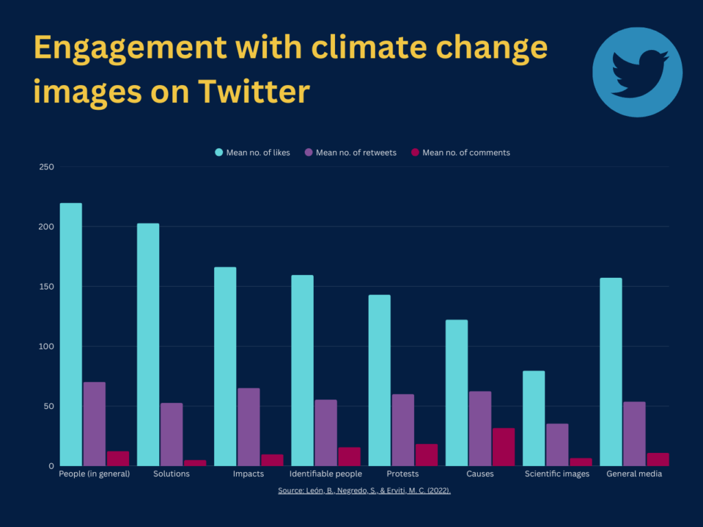 León’s study analyzed 380 images from Twitter’s “top tweets” about climate change over a year. The goal? To figure out which kind of visuals were used most frequently to represent climate change, and which sparked the most interaction—likes, retweets, and comments.